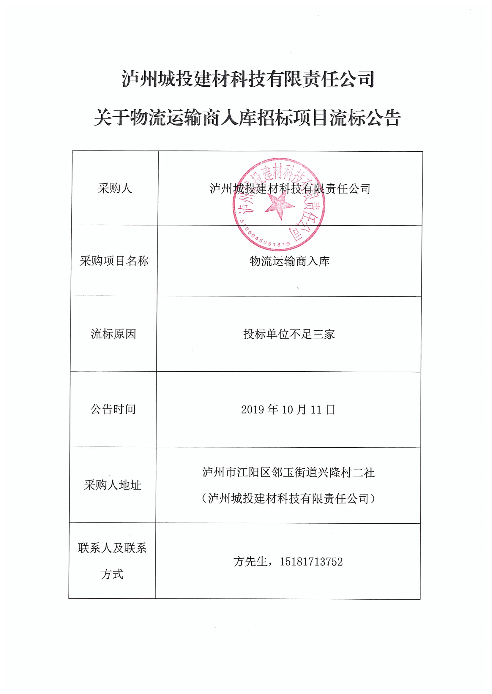 物流運輸商入庫招標(biāo)項目流標(biāo)公告