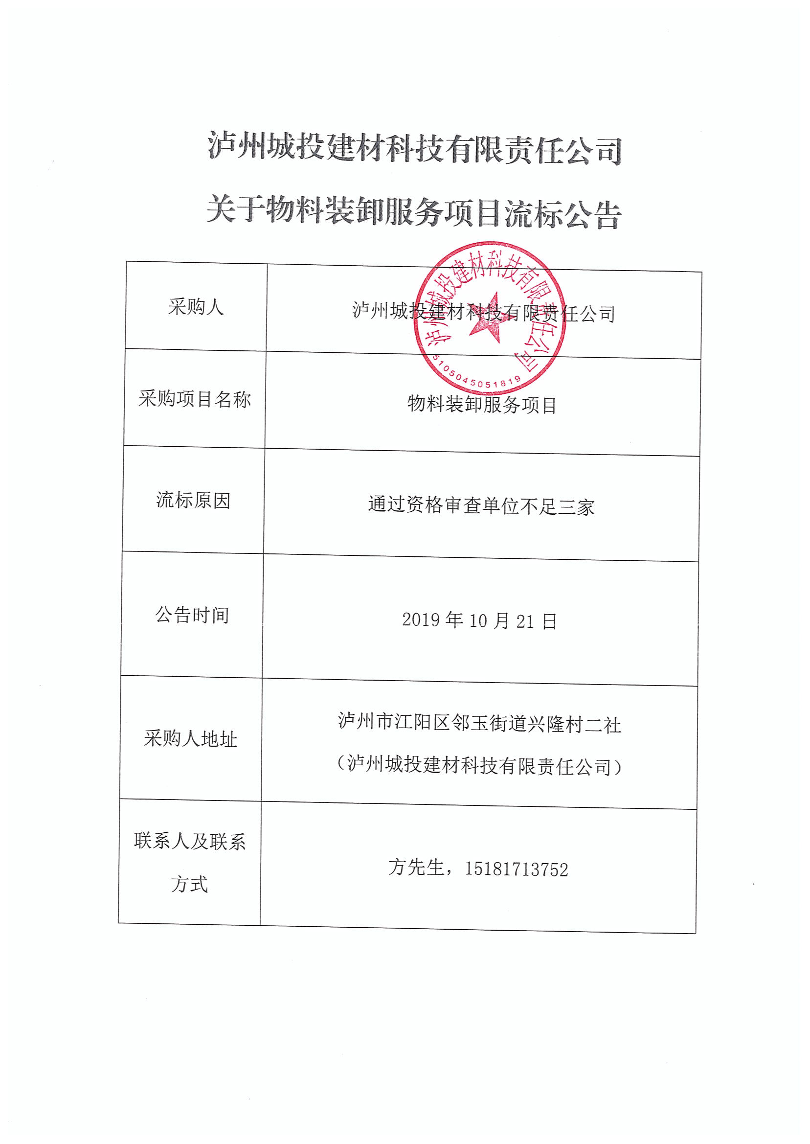物料裝卸服務(wù)項(xiàng)目流標(biāo)公告