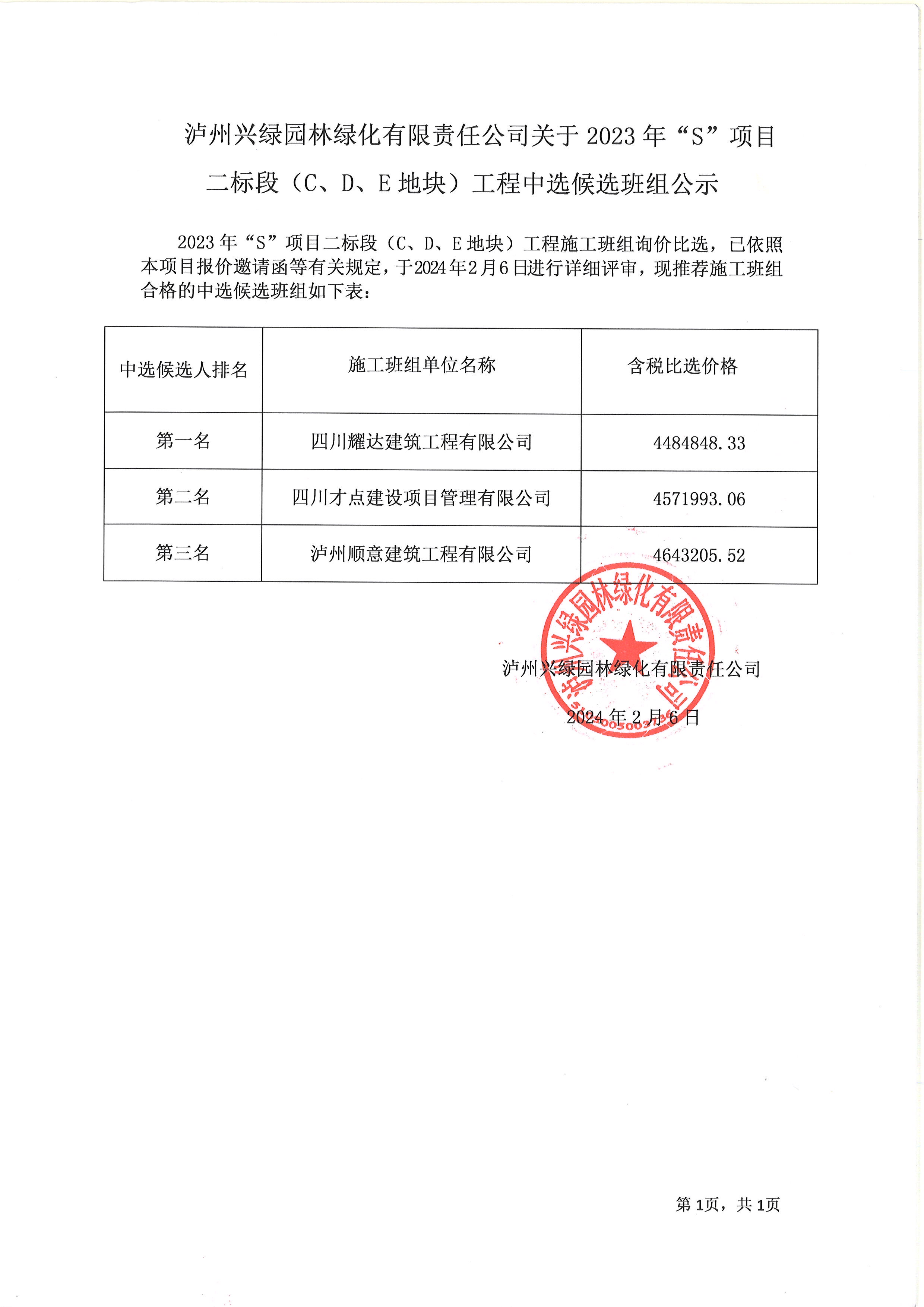 2023年“S”項(xiàng)目二標(biāo)段(C、D、E地塊)工程中選候選班組公示