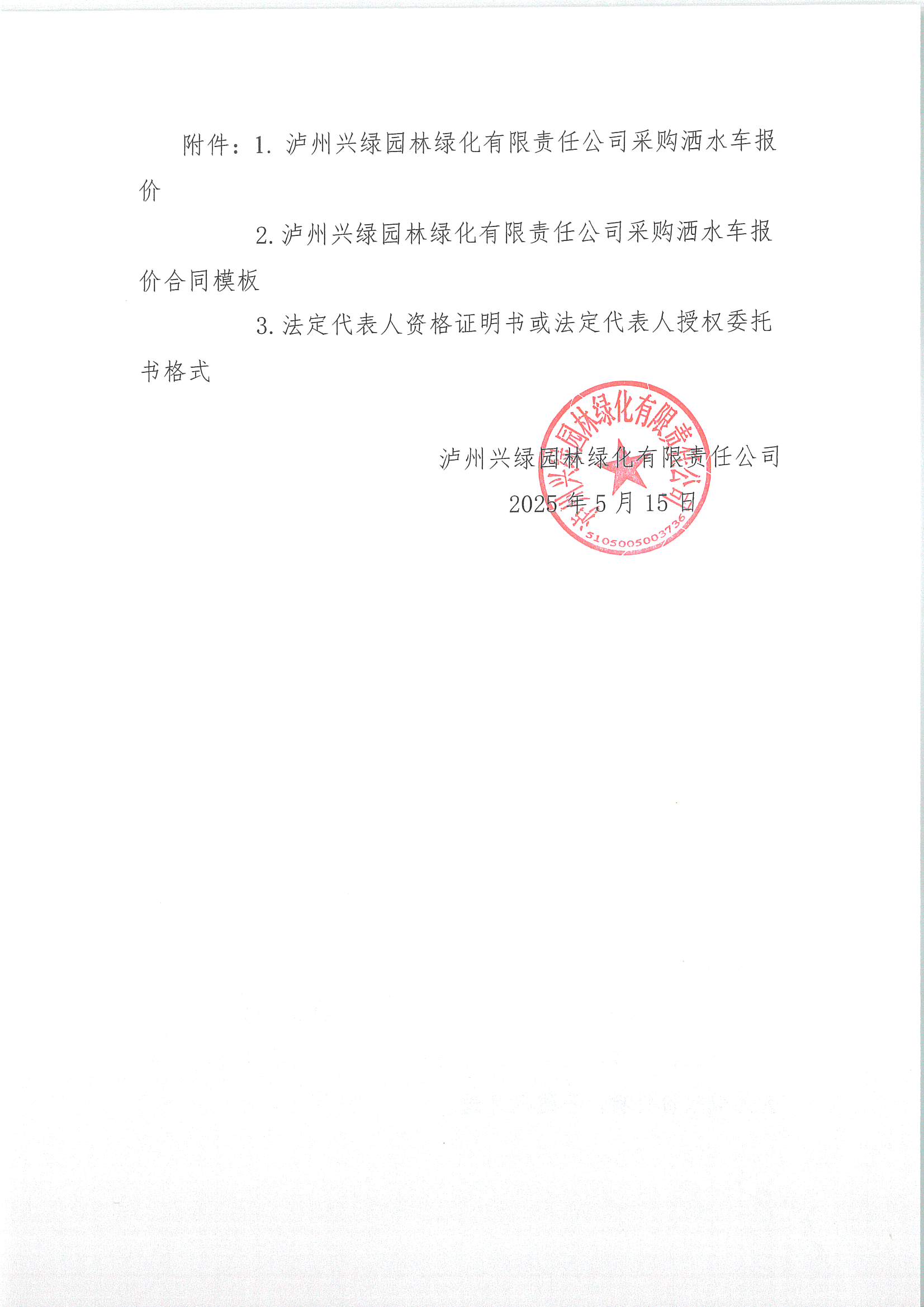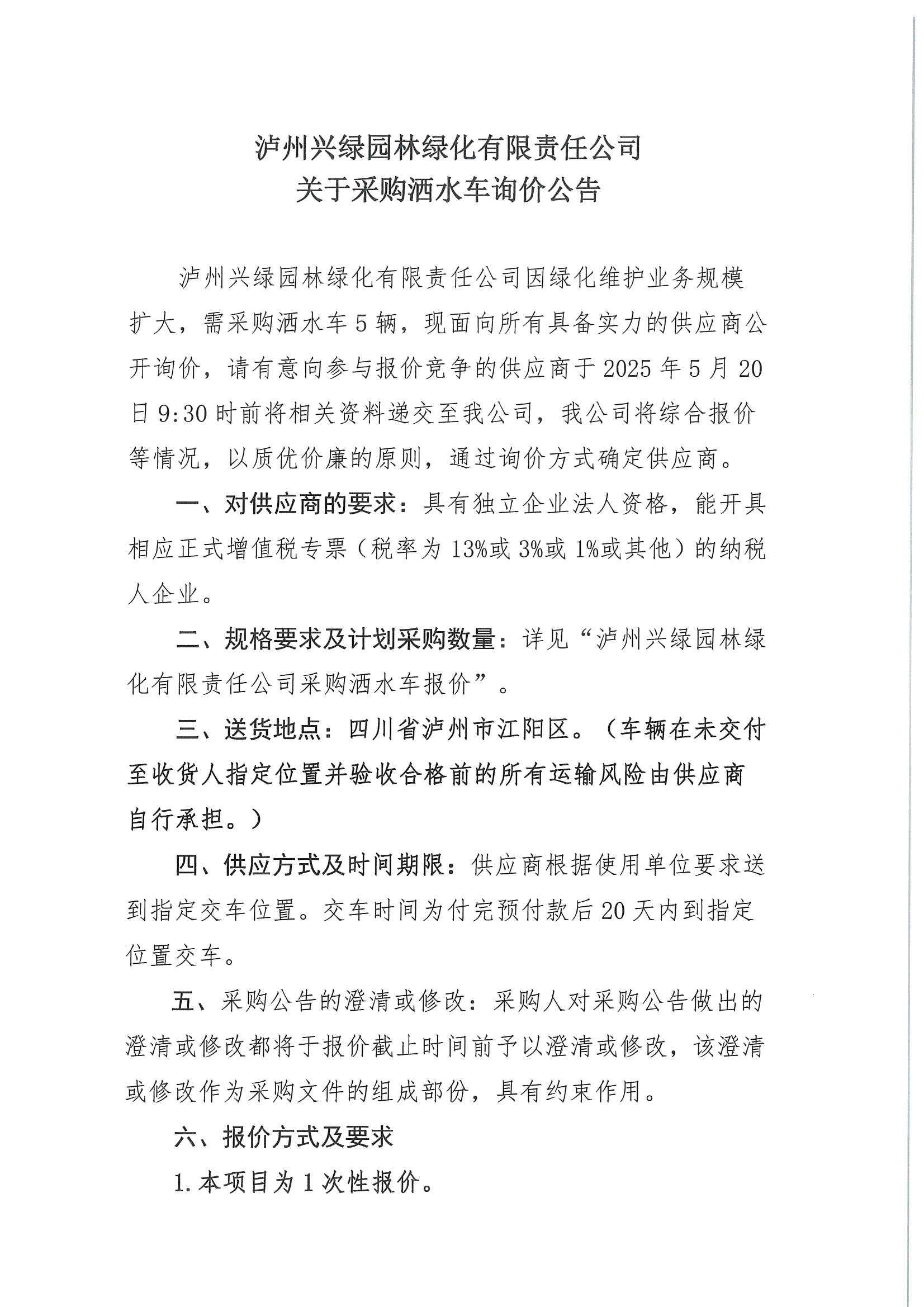 瀘州興綠園林綠化有限責(zé)任公司關(guān)于采購灑水車詢價(jià)公告